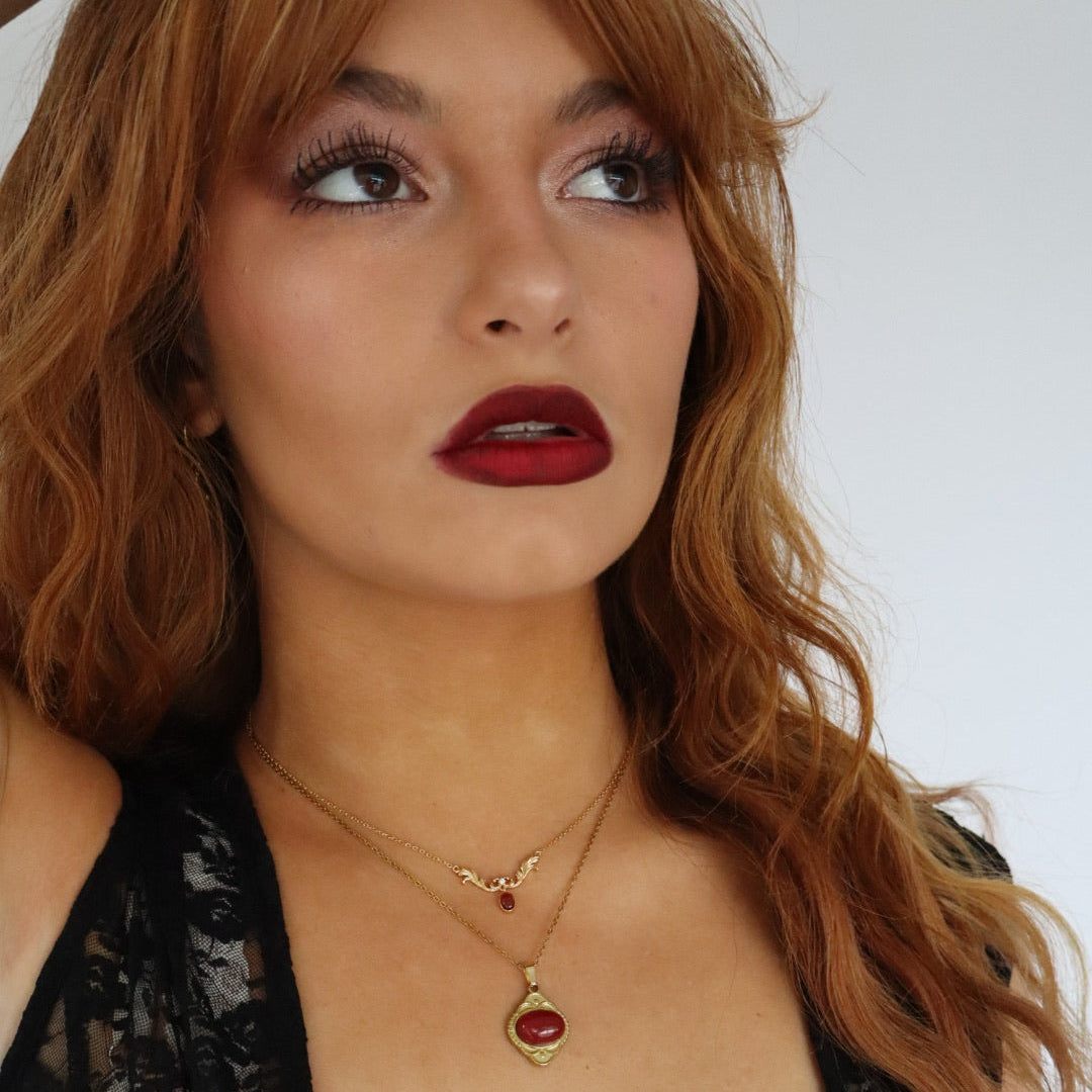 18k gold plated, stainless steel necklace featuring a gold pendant with a large red stone. This necklace is approximately 18" in length and non-tarnish, hypoallergenic, and waterproof.
