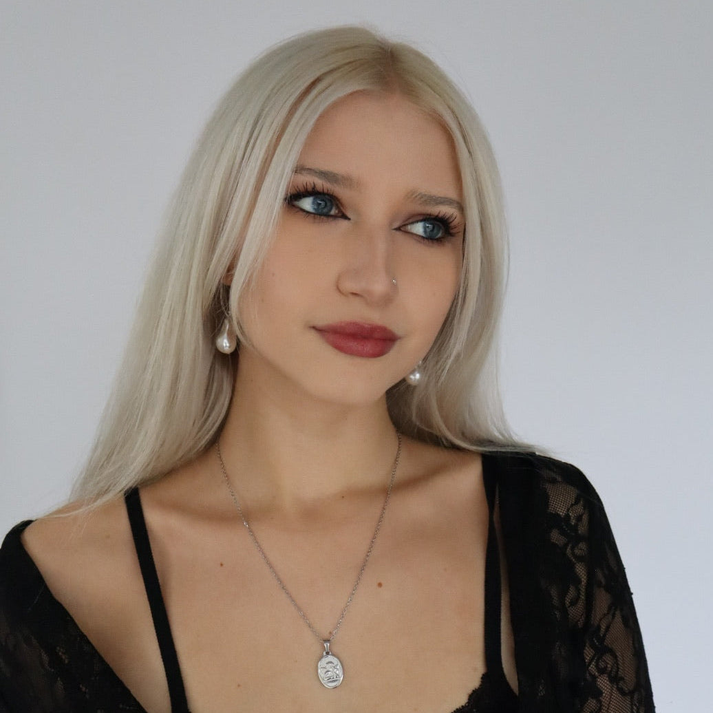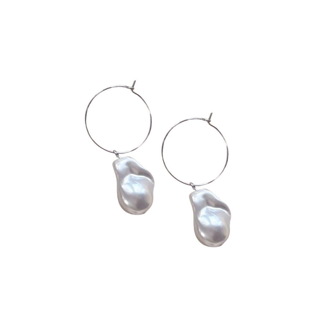 Stainless steel thin hoops with large faux pearl charms. These earrings are handmade, non-tarnish, hypoallergenic, and waterproof.