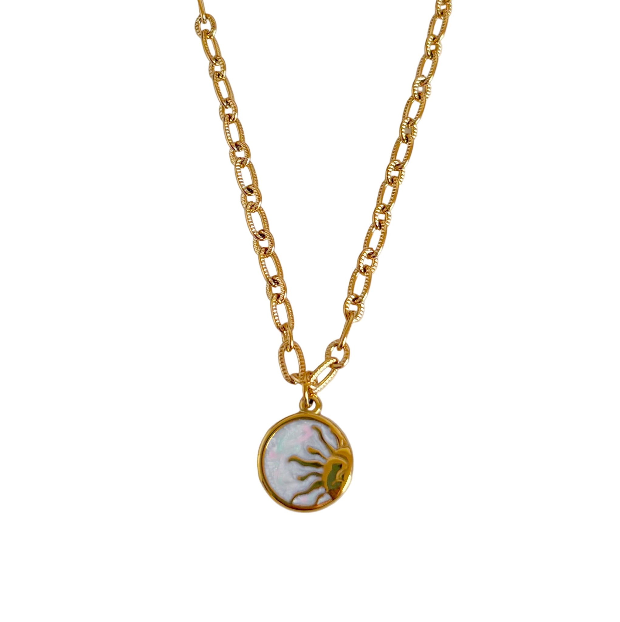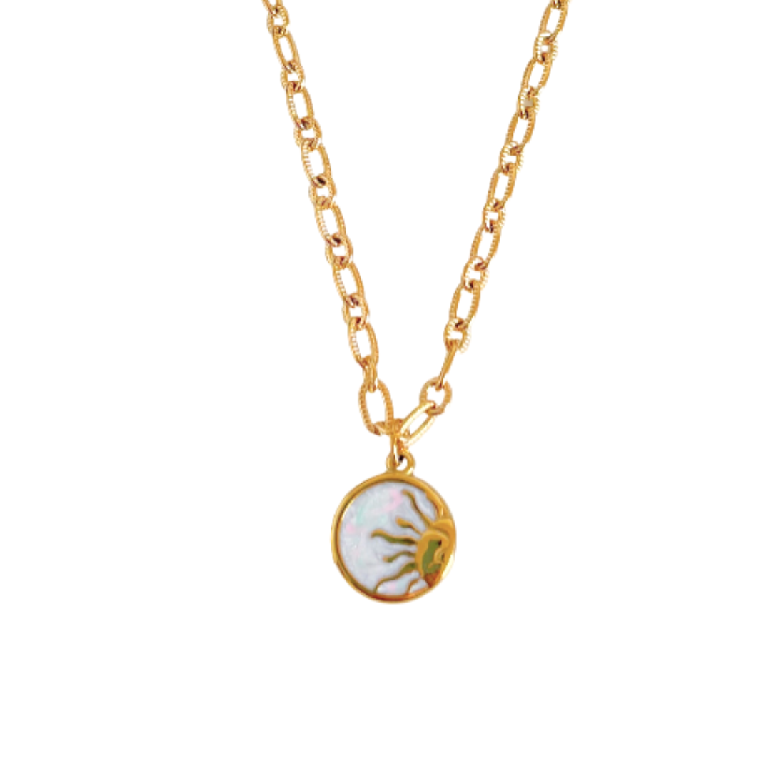 Gold-toned, 18”, stainless steel necklace with a white shimmery enamel sun pendant. This necklace is non-tarnish, waterproof, and hypo-allergenic.
