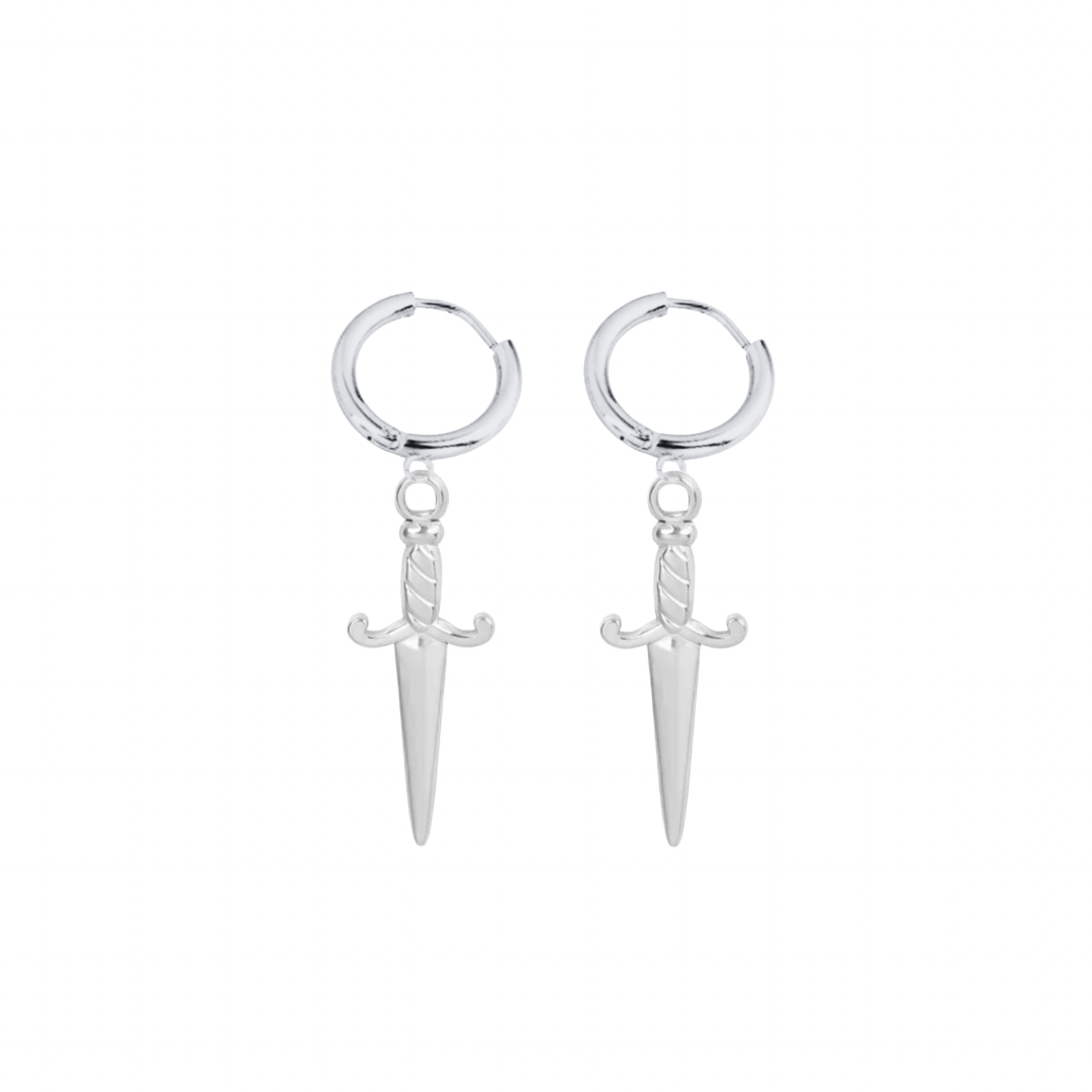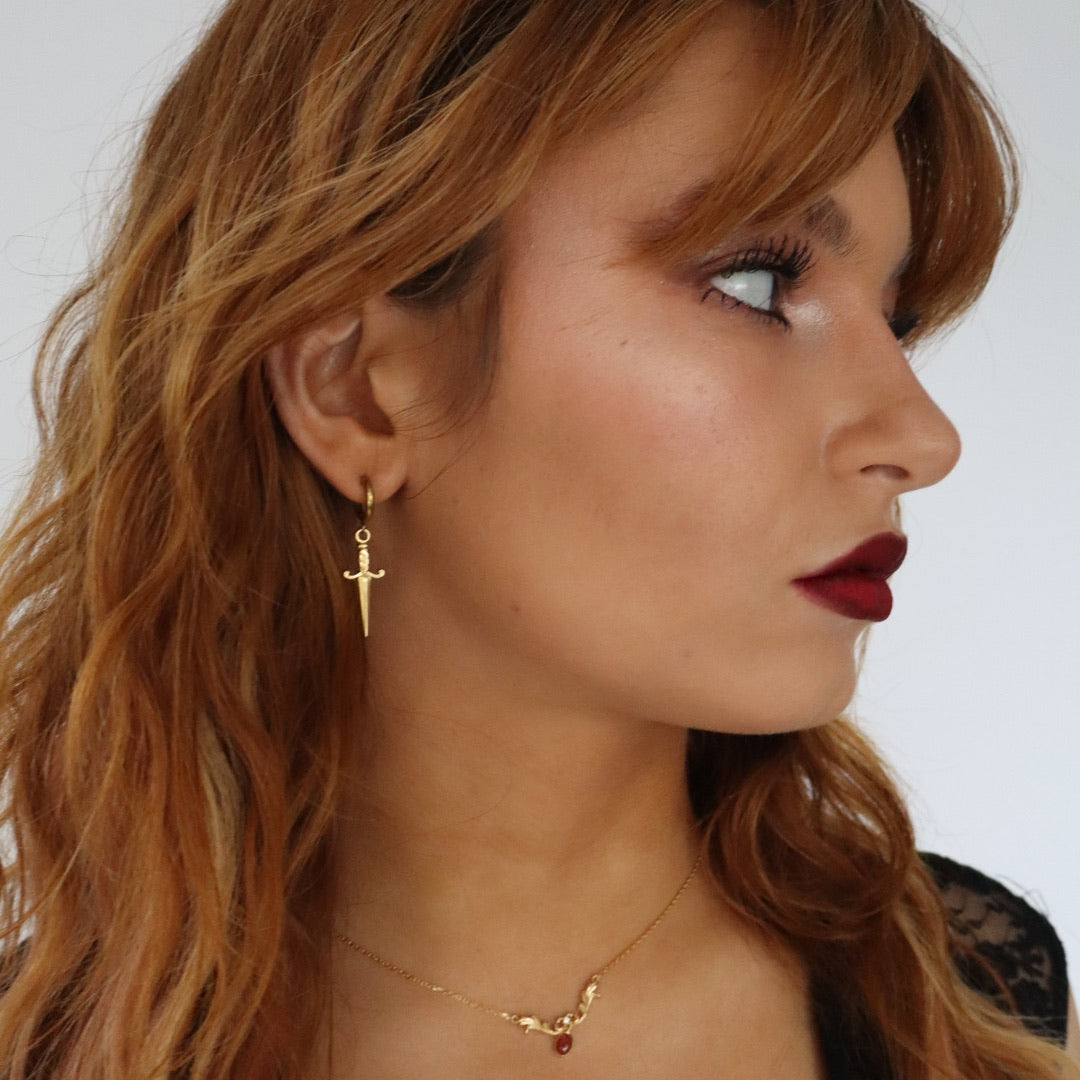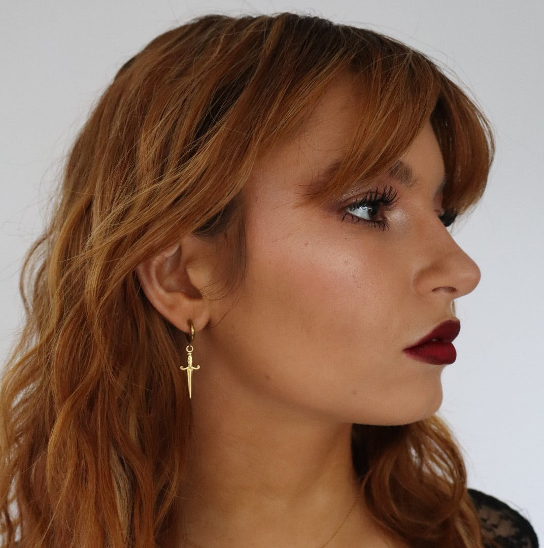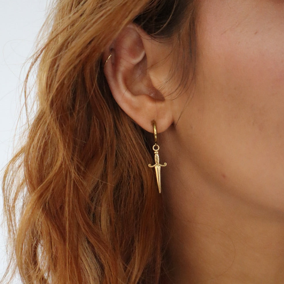 18k gold plated stainless steel dagger charms on huggie backings. These earrings are handmade, non-tarnish, waterproof, and hypoallergenic.