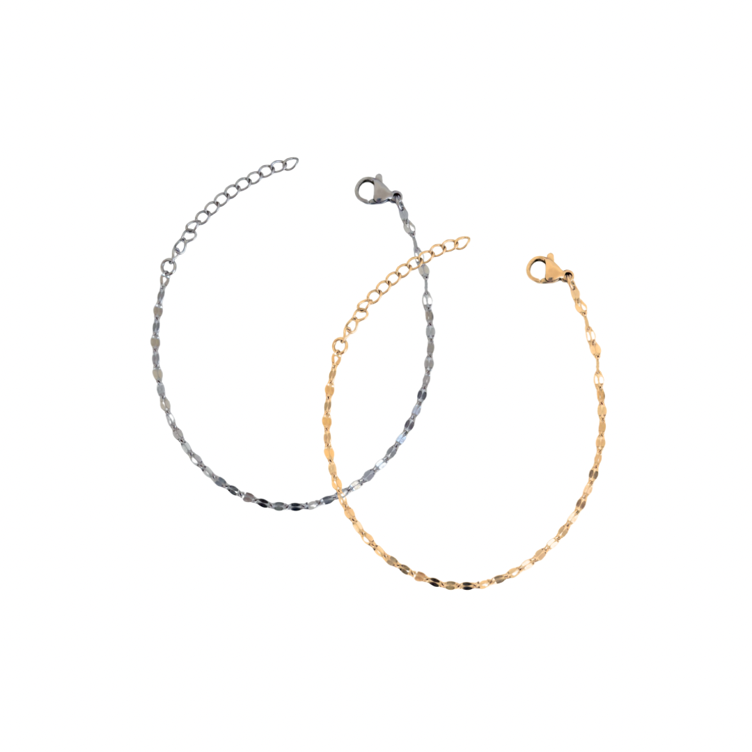 Gold or silver stainless steel, dainty, bracelet. This bracelet is 8” in length. Non-tarnish, Hypo-allergenic, Waterproof.