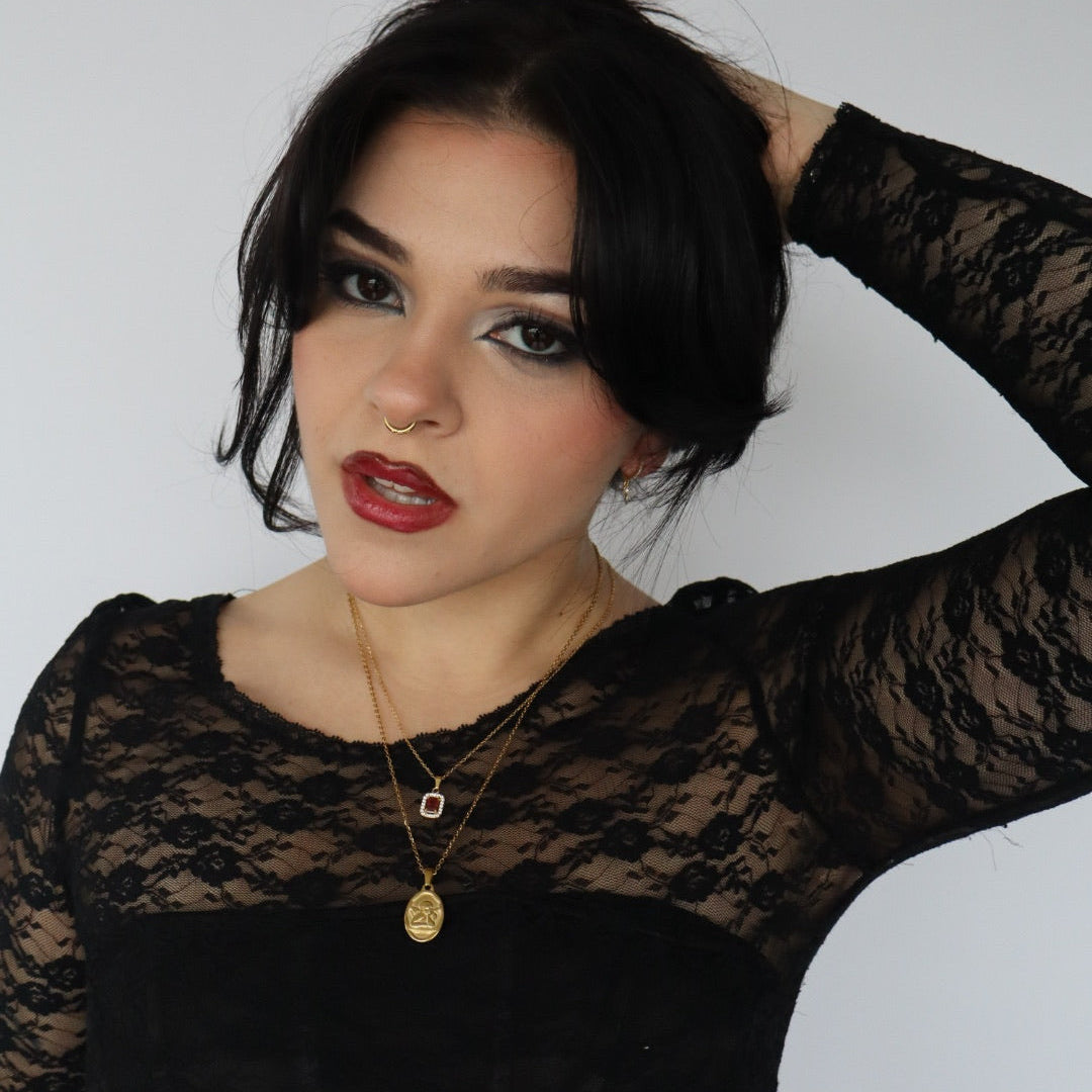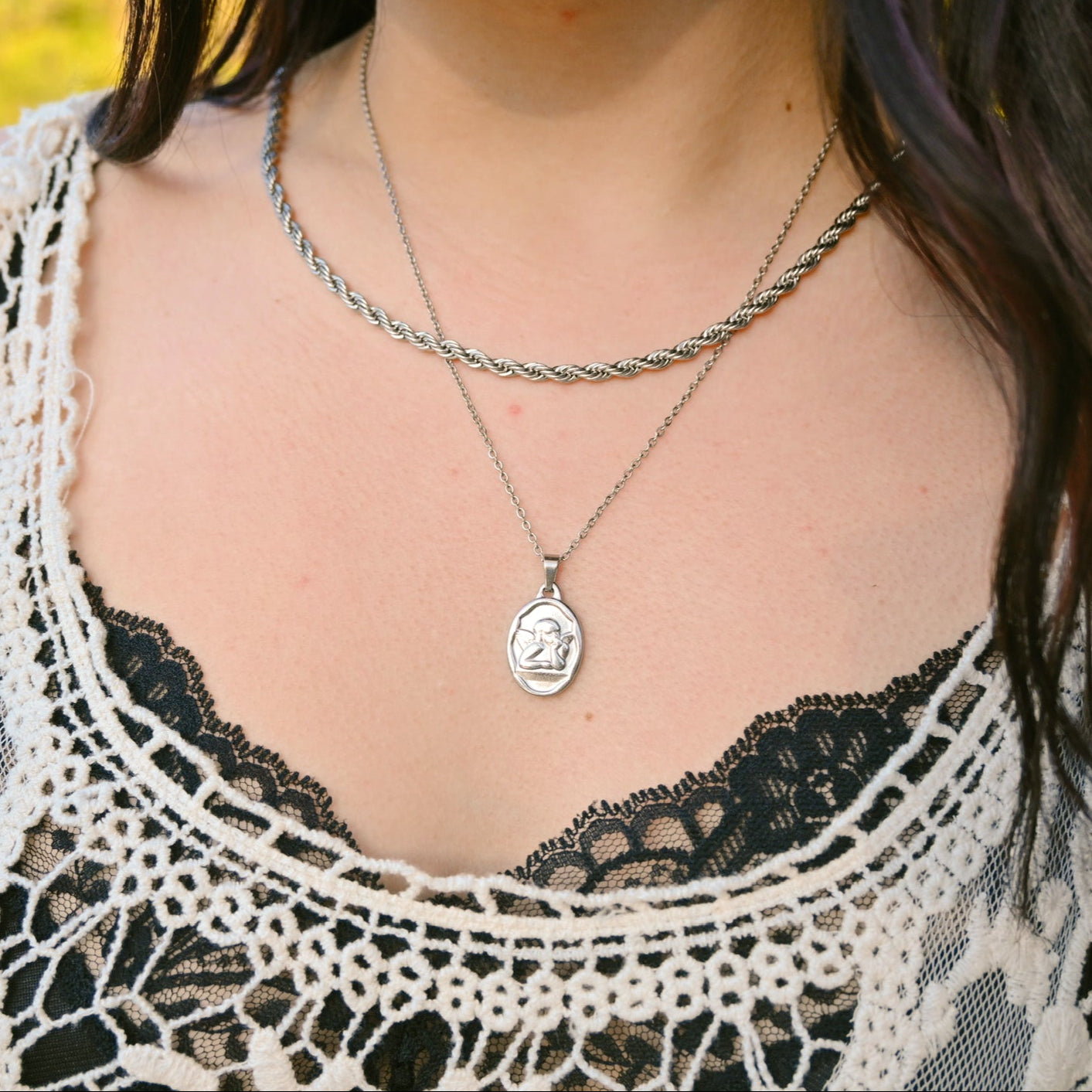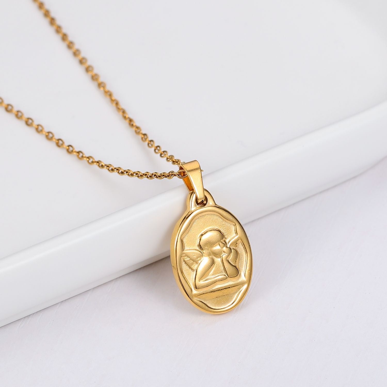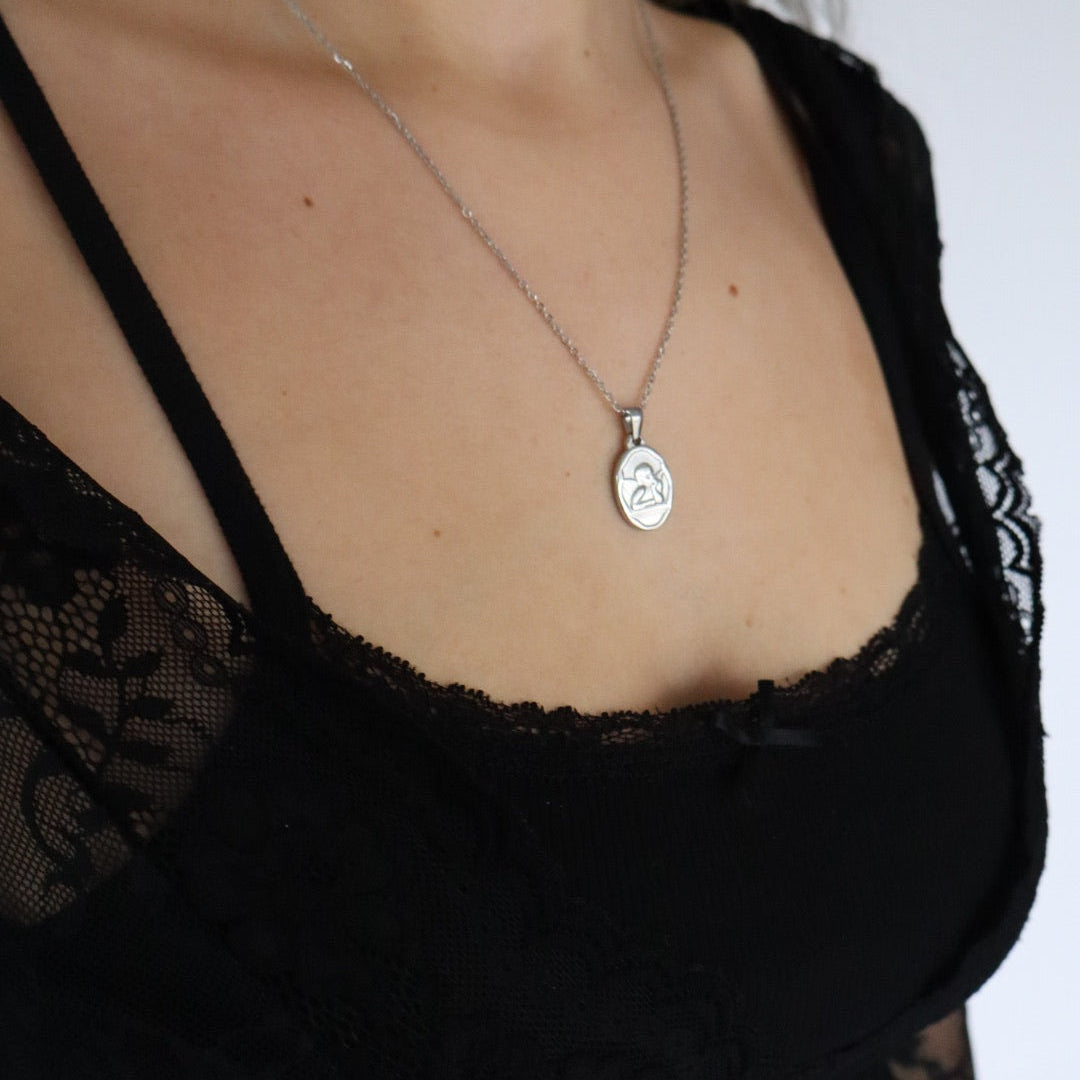 Stainless steel necklaces in silver or gold featuring a cherub design. This necklace is approximately 18" in length with a 2.5" extender, non-tarnish, hypoallergenic, and waterproof.