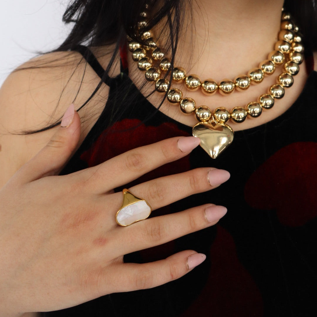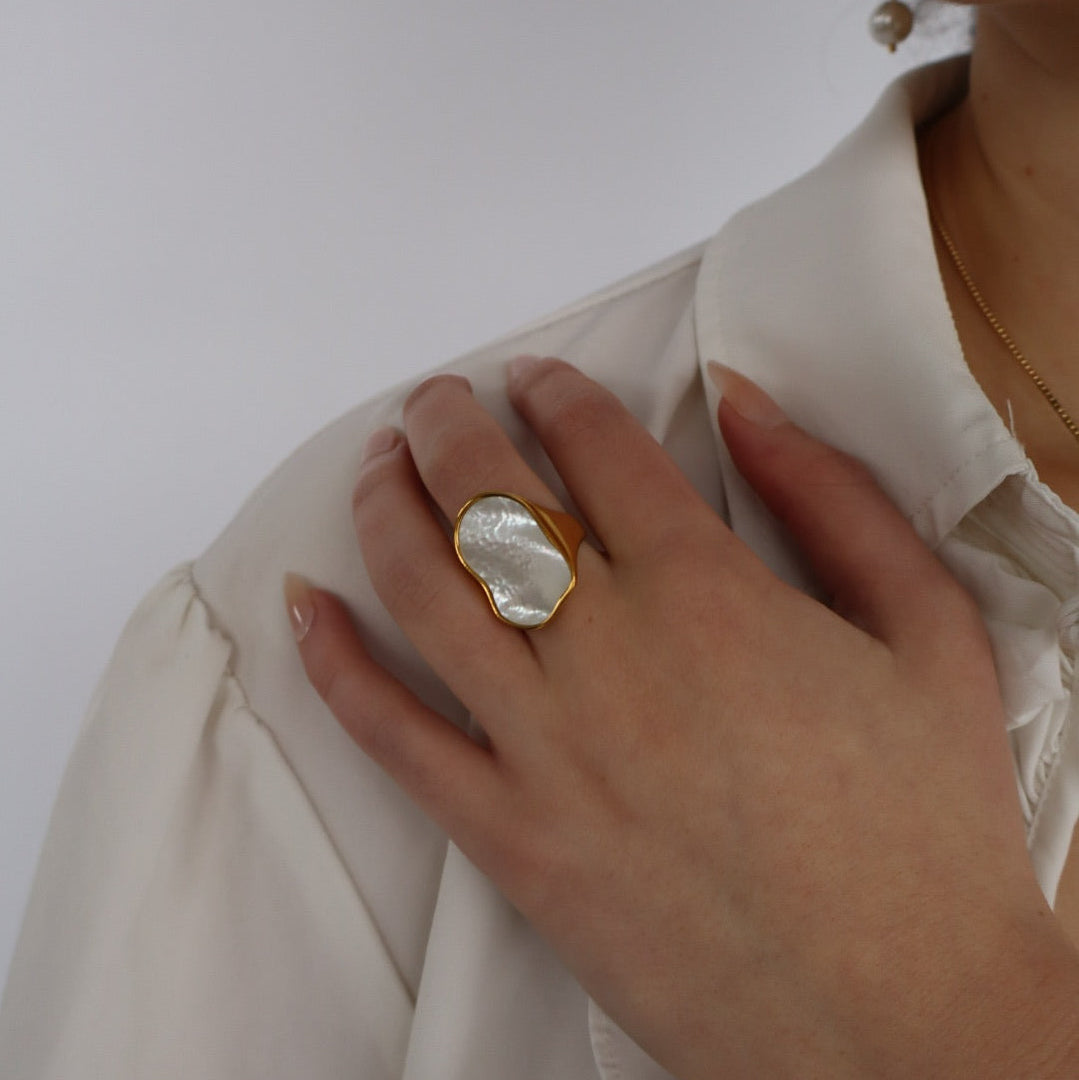 18k gold plated statement ring with mother of pearl inlay. This ring is non-tarnish, hypoallergenic, and waterproof.