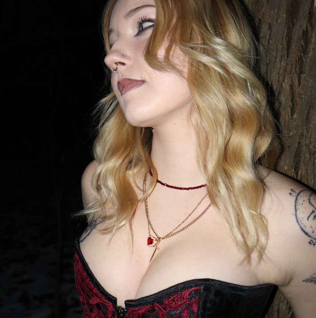 Faceted deep red beaded necklace measuring 15.5” in length with a 3” extender. This necklace has a gold plated clasp and extender.