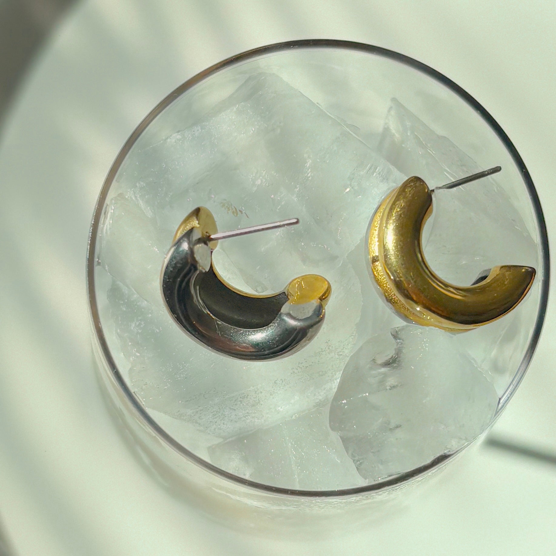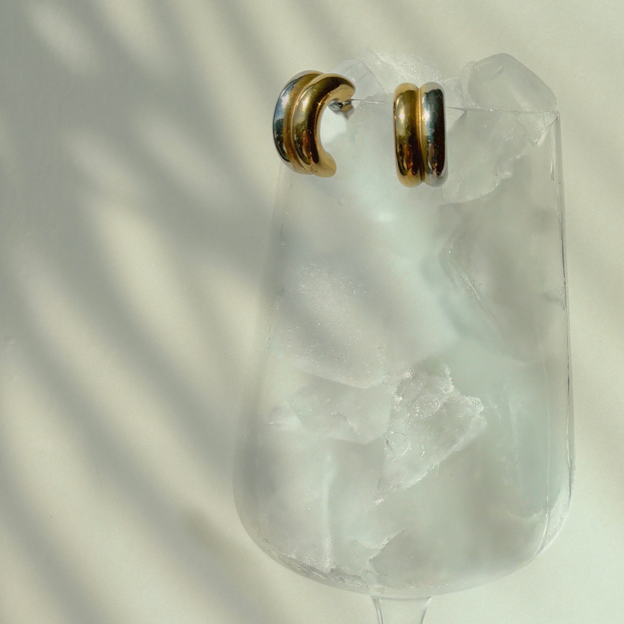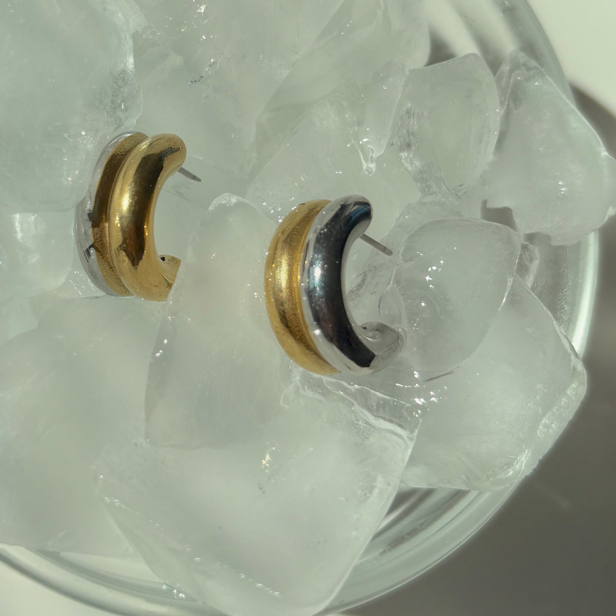 Gold and silver stainless steel mixed metal hoop earrings. These earrings are non-tarnish, hypoallergenic, and waterproof.