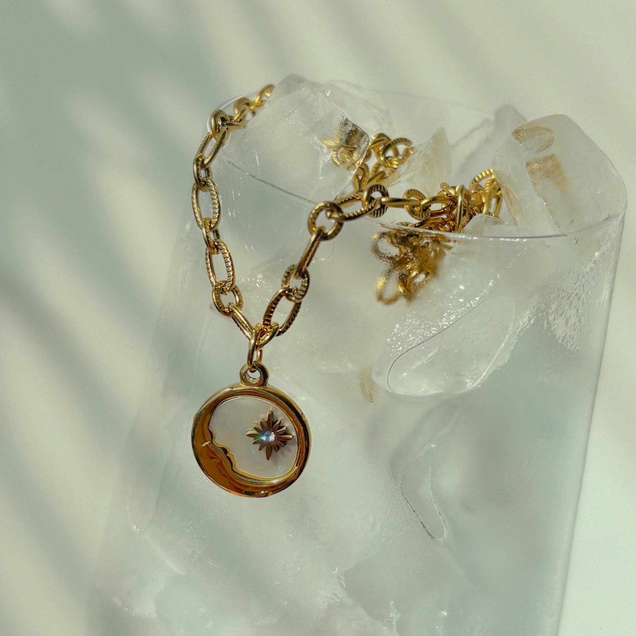 18k Gold plated stainless steel and mother of pearl necklace with a moon pendant design. This necklace is 18” in length, non-tarnish, waterproof, and hypo-allergenic.